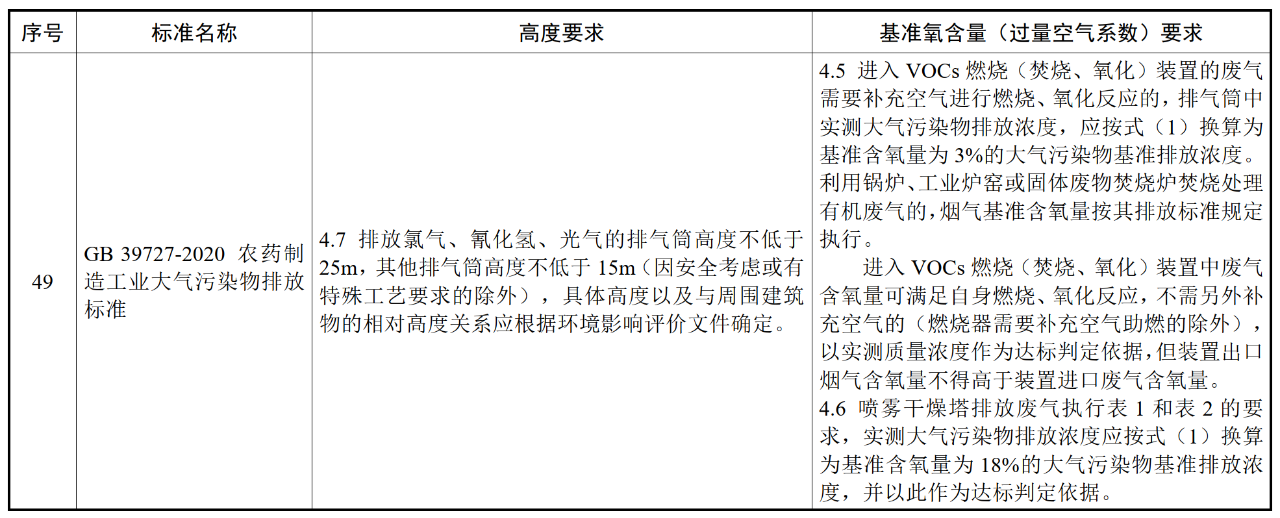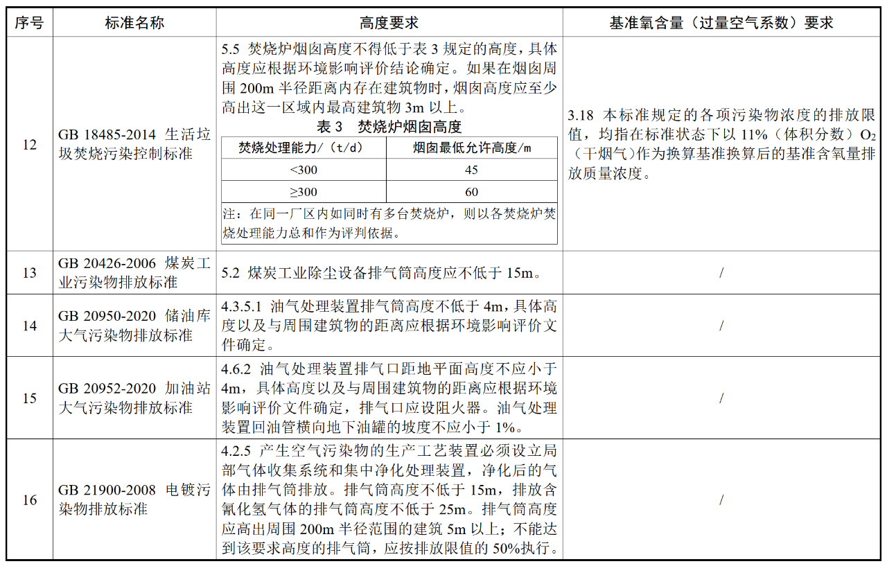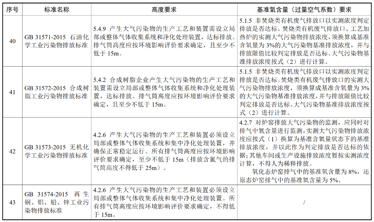 各行業(yè)大氣污染物(含VOCs)排氣筒高度及基準氧含量要求