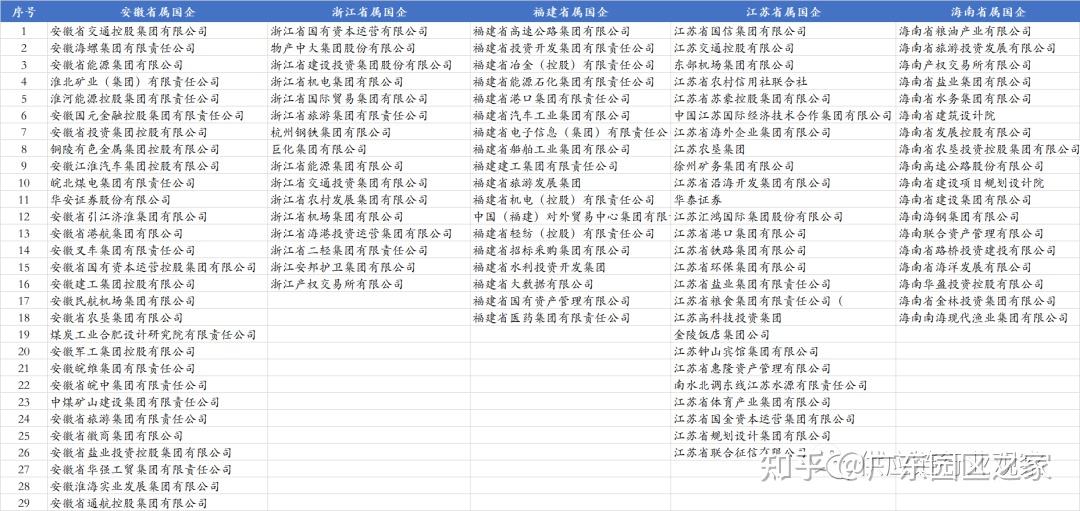 東南一徽包浙江、福建、江蘇、海南、安徽等5省,共107家省屬國企,其中安徽省29家、江蘇省26家、浙江16家、福建18家、海南18家。