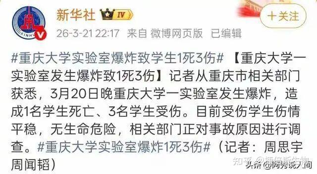 3月20日晚7點(diǎn),重慶大學(xué)科學(xué)城校區(qū)的一個(gè)實(shí)驗(yàn)室突然爆炸。當(dāng)時(shí)有四名學(xué)生在里面做實(shí)驗(yàn),爆炸發(fā)生后一名學(xué)生當(dāng)場死亡三人受傷,現(xiàn)場儀器碎了一地,地上還有血跡。