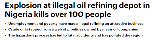非法原油煉制產(chǎn)業(yè)有著致命后果,這些原油通常都是從大型石油業(yè)者們縱橫交錯(cuò)的管線接取, 在簡(jiǎn)陋儲(chǔ)槽煉制成油品. 程序復(fù)雜而危險(xiǎn), 已經(jīng)造成了許多致命意外事故,。