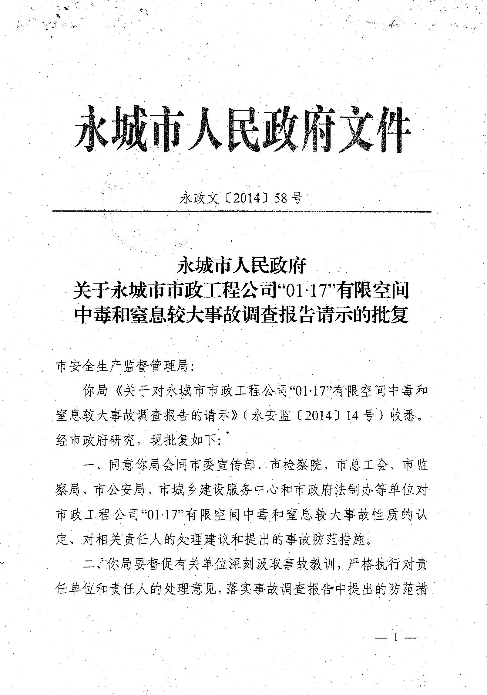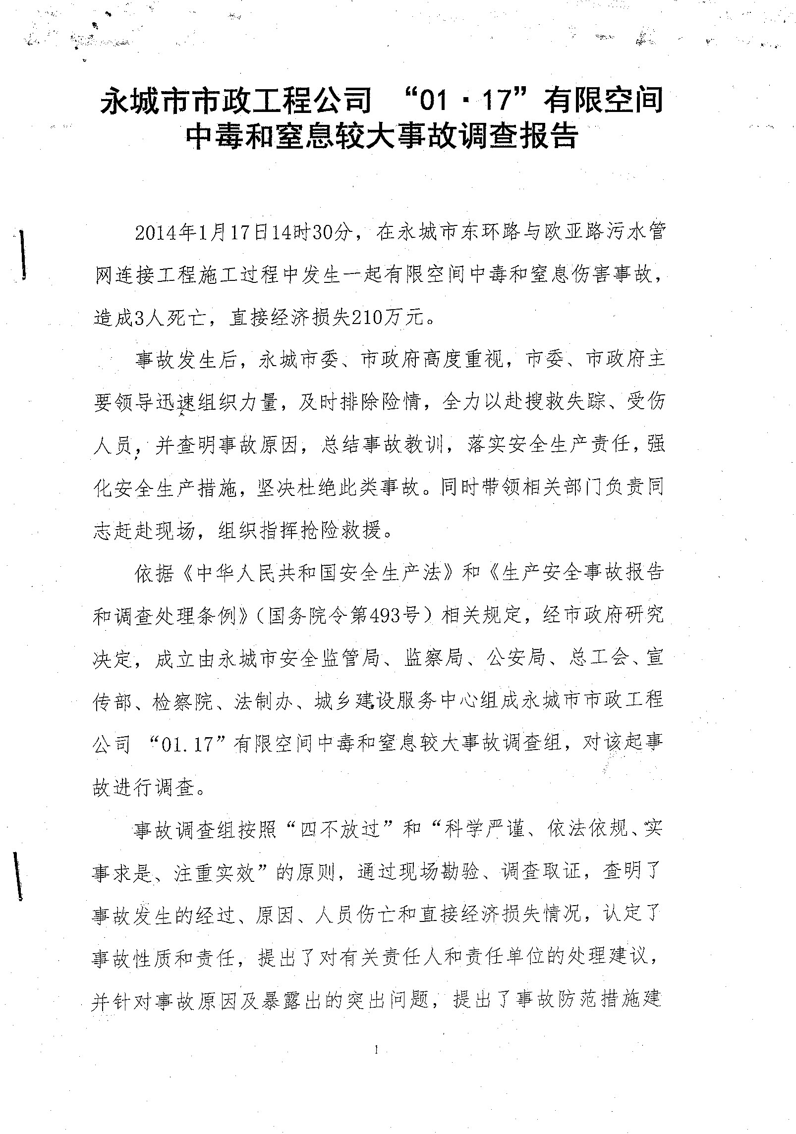 永城市01.17中毒窒息事故調(diào)查報告