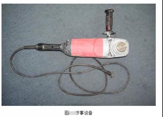 涉事設(shè)備產(chǎn)品名稱為角向磨光機,所有人:彭小共,型號:S1M-HL02B-180,電源電壓:220V-50Hz,額定空載轉(zhuǎn)速:8400r/min,功率:2600W,砂輪外徑:φ180mm,生產(chǎn)單位:蘇州聚匠人五金工具有限公司,銘牌處還有閱讀說明書提示標(biāo)識和佩戴護目鏡提示標(biāo)識,測得涉事設(shè)備的砂輪片安裝軸直徑為φ25.4mm。涉事設(shè)備的前端部位為金屬材質(zhì),其余部位均為塑料材質(zhì)。
