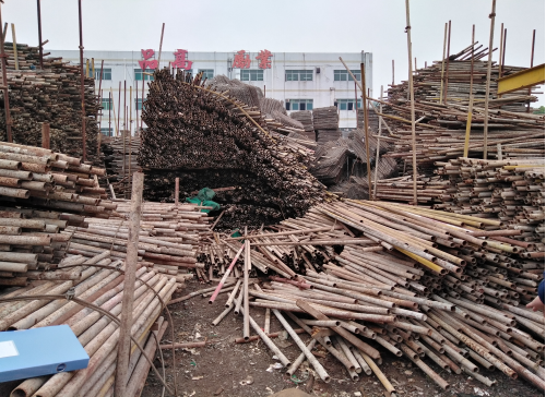 經現(xiàn)場堪查,事故所在地現(xiàn)場堆放了大量鋼管及鋼笆片。鋼管堆垛支撐骨架由豎向三根鋼管(分左右兩側六根)、橫向三根鋼管組成,豎向鋼管與橫向鋼管通過扣件連接緊固,從而搭成一個支撐骨架。骨架搭建好后,便向上堆放散裝鋼管,每堆好一層鋼管(層高約75cm),便用橫向鋼管與豎向鋼管用扣件固定,共堆放6層,鋼管堆垛高約4.5m(0.75m×6層)。鋼笆片堆垛則較為凌亂,且部分鋼笆片未與鋼管堆垛分開堆放。堆垛現(xiàn)場見下圖一。