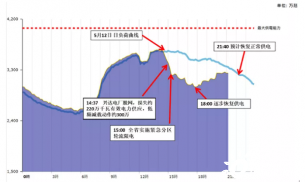 5月13日14時37分,興達(dá)電廠因接入345千伏路北變電站母線故障,導(dǎo)致電廠電力送出受阻,兩臺燃煤及兩臺燃?xì)鈾C組脫網(wǎng),系統(tǒng)損失有效電力供應(yīng)約220萬千瓦,造成臺灣系統(tǒng)頻率驟降,為維持電網(wǎng)穩(wěn)定,電力系統(tǒng)在第一時間自動啟動低頻卸載約300萬千瓦。臺電評估短時間內(nèi)無法立即復(fù)電,為維系電力系統(tǒng)安全,自下午3時起執(zhí)行緊急分區(qū)輪流停電,最大限電達(dá)到350萬千瓦。事故過程系統(tǒng)負(fù)荷變化曲線下圖所示。