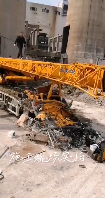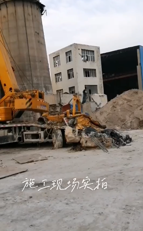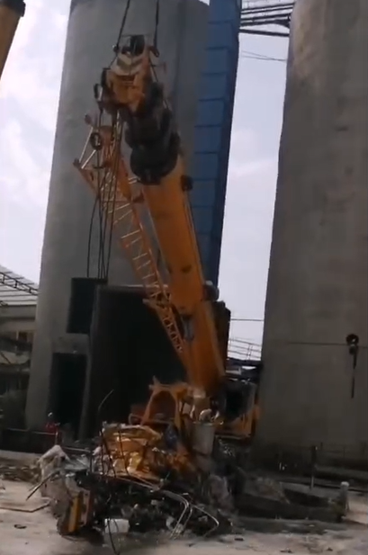 在某電廠內(nèi)容,一臺25k5吊車正在準(zhǔn)備開始吊裝工作,不料遭遇飛來橫禍,天降重物砸頂,車頭部分瞬間粉碎,幸好人沒有在車上...