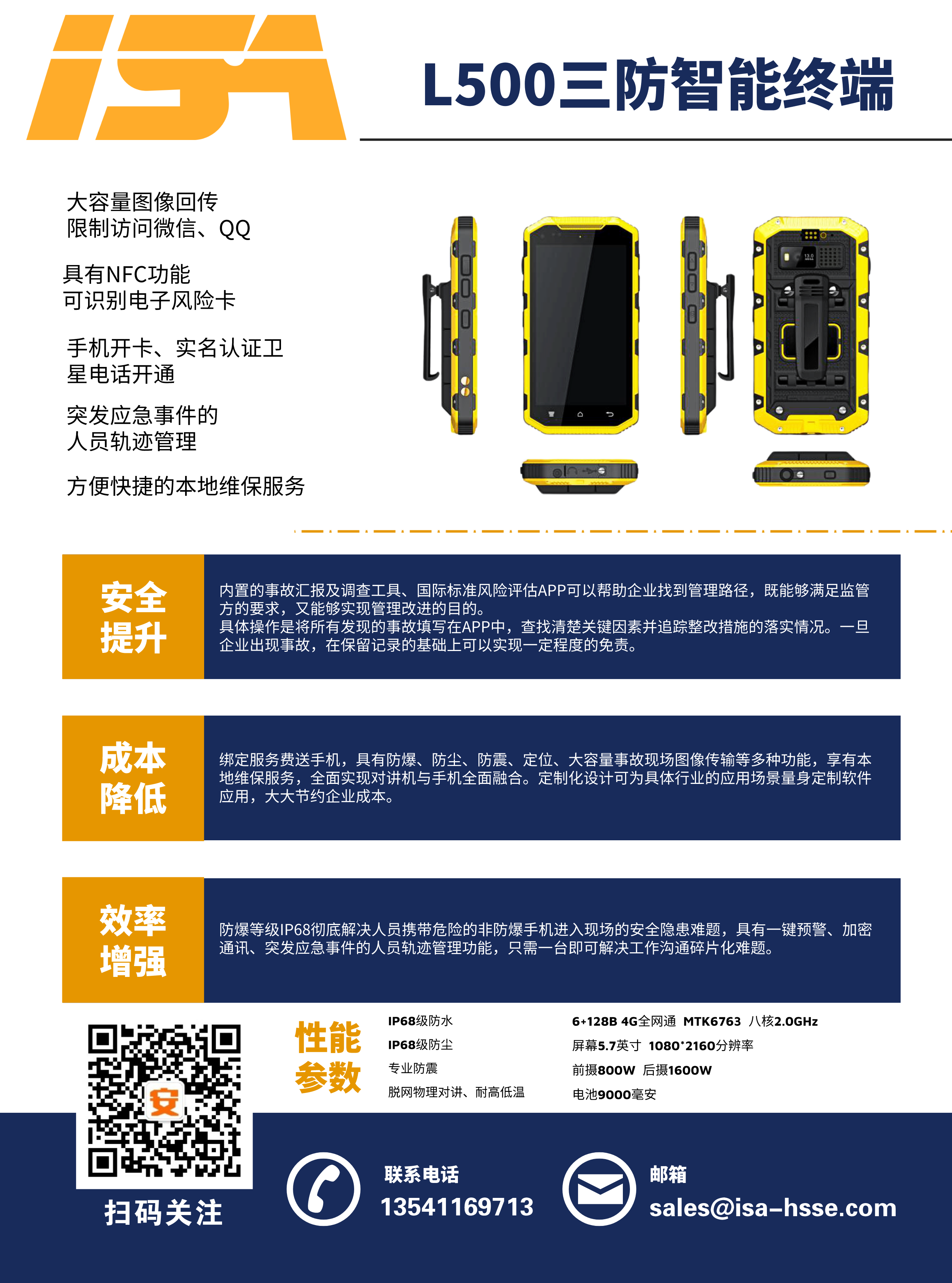 公司與運(yùn)營商推出一款集手機(jī)、對講機(jī)于一體的防爆手持終端,包括各類商業(yè)安全軟件的使用、圖像回傳功能、一鍵報(bào)警、限制訪問微信QQ、NFC等功能。內(nèi)含事故管理APP(隱患排查、風(fēng)險(xiǎn)評估),0元開卡,綁定即送話費(fèi)流量,支持定制化服務(wù)。